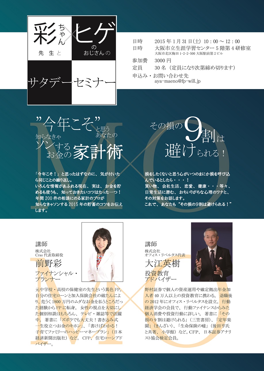 彩ちゃん先生こと、FP前野彩が伝える「今年こそ!と思うあなたの知らなきゃソンするお金の家計術」と、投資教育アドバイザーである大江英樹氏が新刊のマル秘内容と共に語る「その損の9割は避けられる!」セミナー。